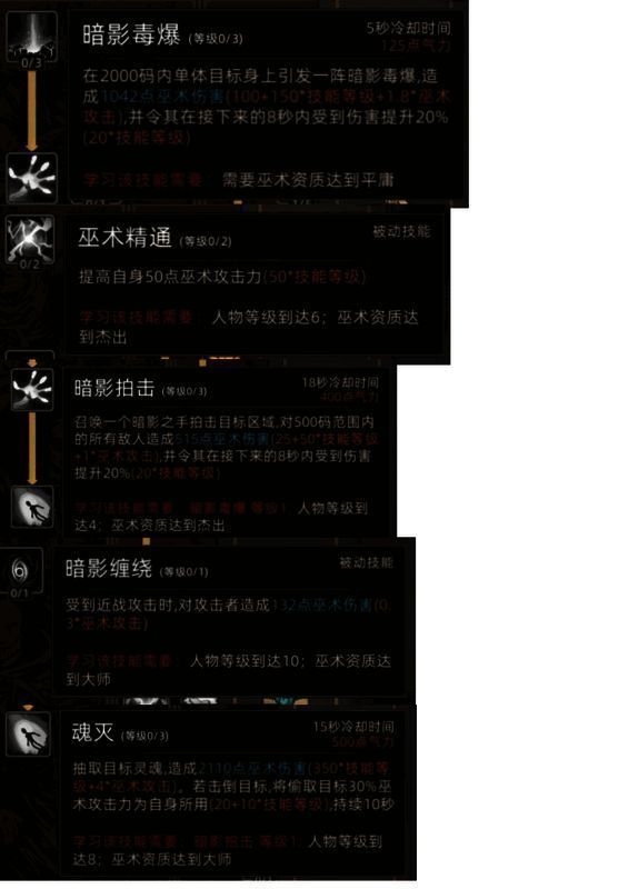 暗巫术的增伤是非常恐怖的,3级暗影拍击可以给敌人附加60%的受伤提升,暗影毒爆也给敌人提供60%受伤提升。