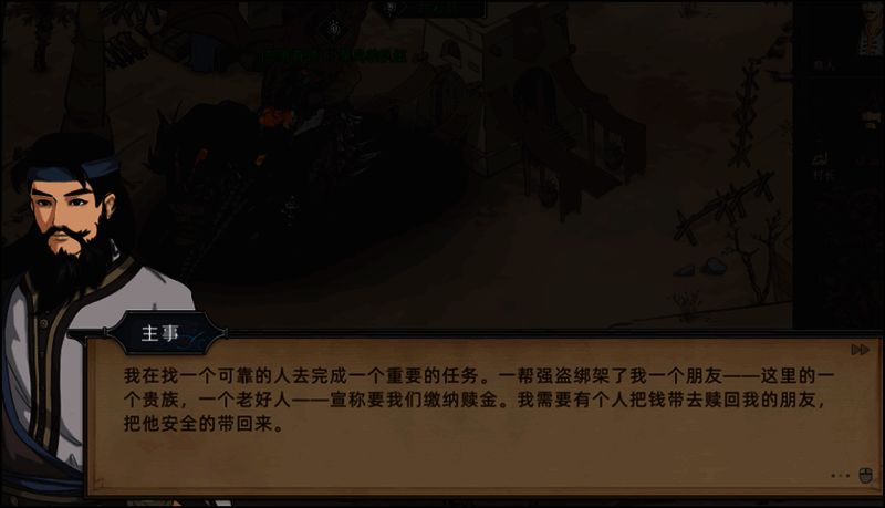 例如这个主事,和他对话后可以接取一个任务,任务大多数比较简单,除了要求带货和护送商队,带货往往要求到其他地区购买特产,需要长途跋涉,没装传送类mod不推荐接取,还需要购买当地通商许可,收益也少的可怜,商队则需要护送一队商人,很浪费时间,有功夫护送不如待在门口坐等npc出来巡逻,其他的任务主要有:找回村民(城镇附近3队,一般有一队需要给钱或者打一顿)清除山贼(城镇附近一队)和最有油水可捞的交赎金(其他城镇一队,可以选择不交1000赎金直接击败山贼)