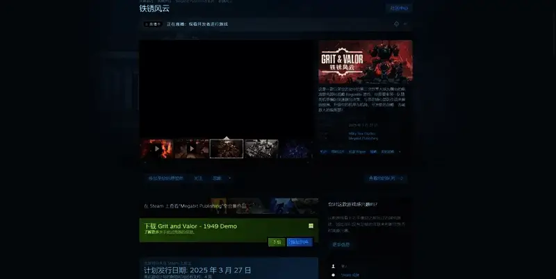 《铁锈风云》是由Milky Tea Studios制作、Megabit Publishing发行的一款平行世界第二次世界大战柴油朋克实时战术Roguelite游戏,而这款游戏的发售时间就是2025 年 3 月 27 日,游戏预载时间大概是前一天,到时候注意一下即可。