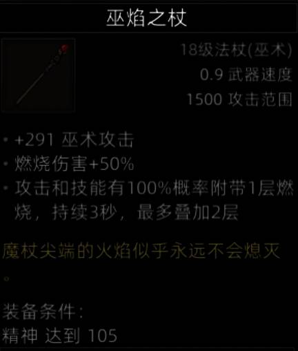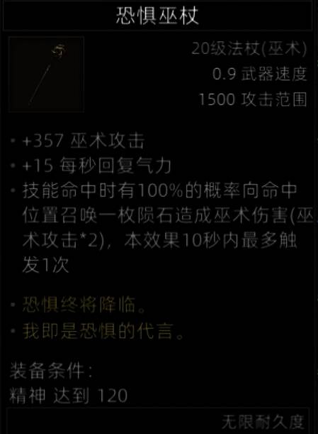 扭曲塔出的恐惧巫杖是目前输出最厉害的法杖,357之高的巫术值加成,而且还有10秒一次的2倍巫术值伤害的陨石,这就相当于直接上了一个高倍率的技能。