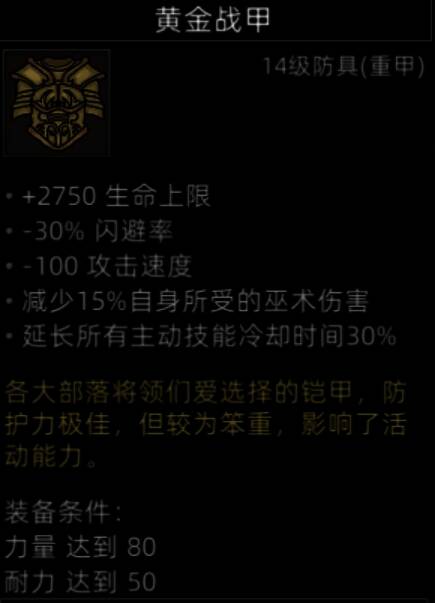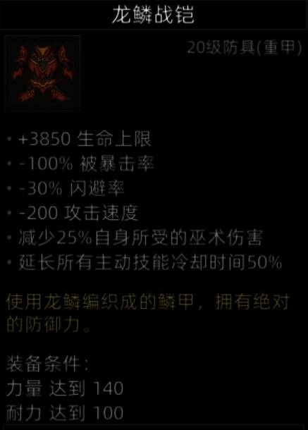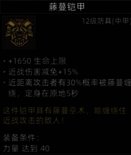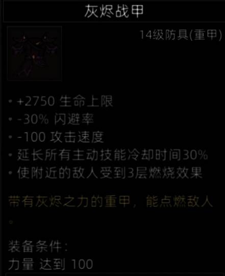 非常好的防具,给拥有免疫燃烧的肉盾穿,超高的生命值加成,两个控制词条,防具中的极品。