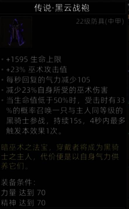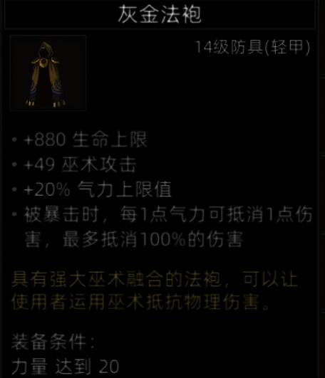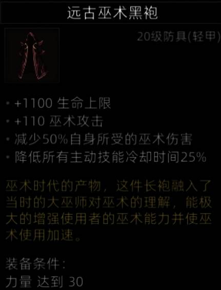 防具中数一数二的存在,50%的巫术减伤,25%的CD减少,玩巫师穿上就是行走的巫术炮台。