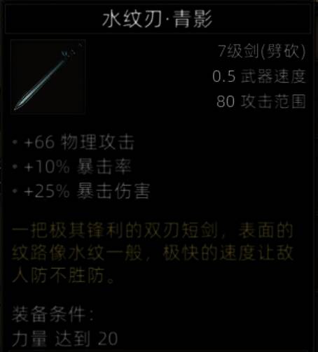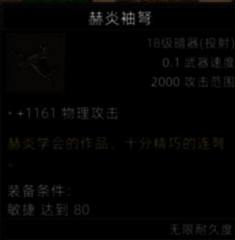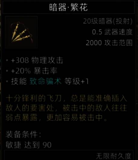 还算可以的暗器,好像有个NPC有致命骗术被动,可以招募进队,这武器就给有骗术被动的队友,那就20%概率,还算可以。