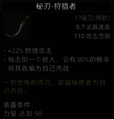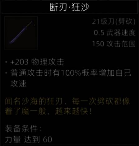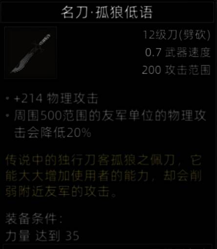 死亡如风,常伴吾身,带这把刀就不能有队友,不然敌人都还没死两个,队友先死完了,而且这把刀只有蛮力战士和野性之魂能带,玩其他带着就是找死。