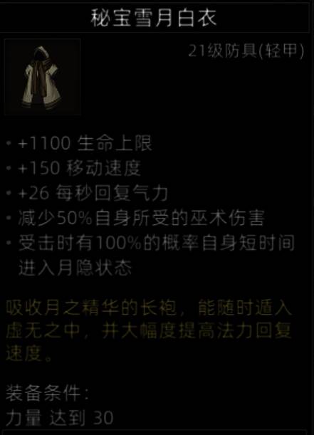 脆皮保命防具中的极品,有移速、和超高的气力回复、50%的巫术减伤,最重要的是受到攻击就隐身一段时间。