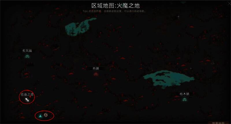 扭曲塔位于火魔地图左下角,只能通过地图上的三个传送门进入,地图右下角、右上角、左上角都有一个魔界传送门。