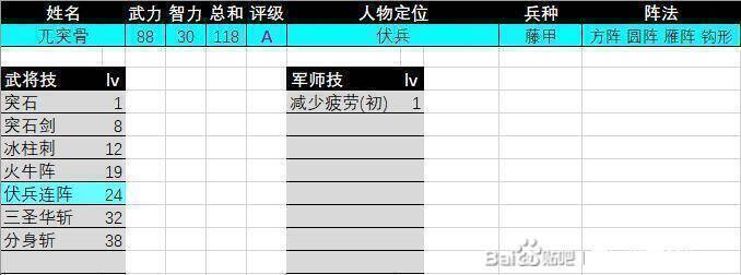 边缘高武伏兵将,武力够高是亮点,连阵出的也非常早,但是智力太低导致蓝条太短,蓝用来造兵都不太够,三圣华斩和分身斩这种高耗蓝技能真的是用不起。自带藤甲兵,阵型丰富好评。