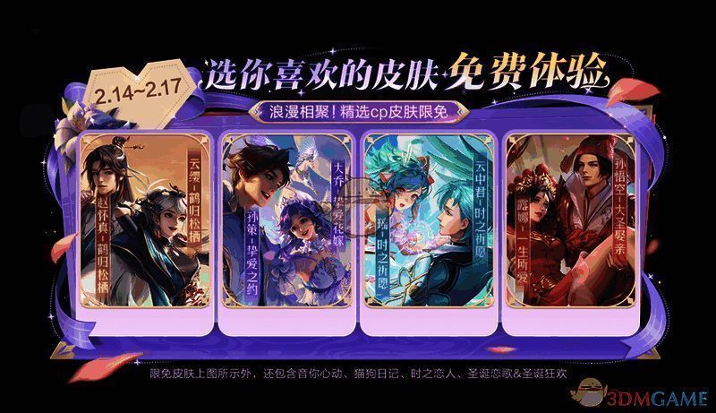 皮肤限免范围:云缨-鹤归松栖、赵怀真-鹤归松栖、大乔-挚爱花嫁、孙策-挚爱之约、瑶-时之祈愿、云中君-时之祈愿、露娜-一生所爱、孙悟空-大圣娶亲、小乔-音你心动、周瑜-音你心动、大乔-猫狗日记、孙策-猫狗日记、孙尚香-时之恋人、刘备-时之恋人、貂蝉-圣诞恋歌、吕布-圣诞狂欢