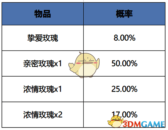 购买红蓝对决(1日),可额外获赠一个礼包,打开后可随机获得以下之一:挚爱玫瑰x1、亲密玫瑰x1、浓情玫瑰x1、浓情玫瑰x2。累计20次至少可获得挚爱玫瑰x1。