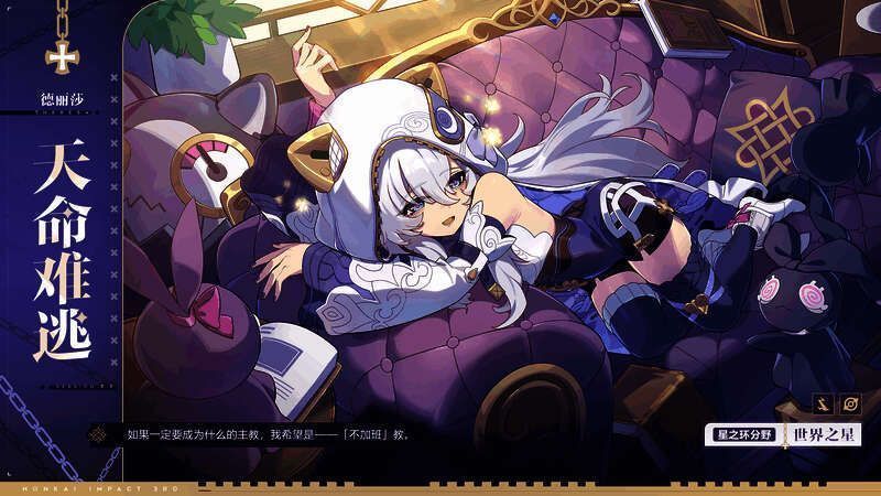 全新S级角色德丽莎「天命难逃」为量子属性角色,使用链刃进行攻击,并造成雷电元素伤害。作为天命主教的德丽莎,有着因加班而疲惫不堪的姿态,以及睡眠不足导致的黑眼圈。她时常戴着眼罩和兜帽,以便随时进入摸鱼状态。