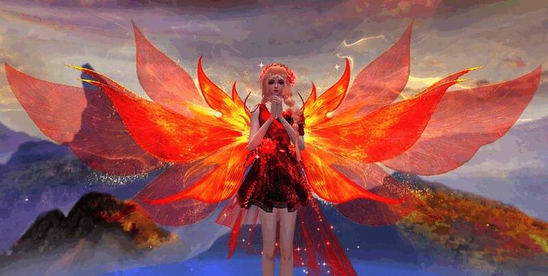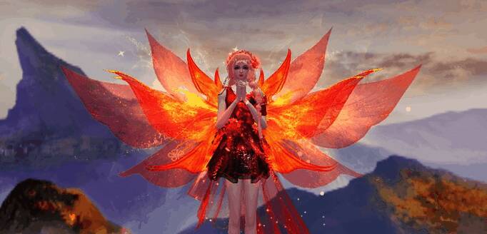 羽翼以蝴蝶为灵感,羽翼内层为渐变橙红色,仿佛有热烈的火焰在其间舞动。外层的羽翼呈半透明状,若隐若现,如同晨露晶莹剔透。每一片羽翼都刻印着金光闪闪的纹路,熠熠生辉!