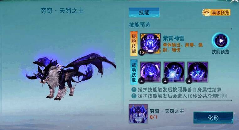 上阵已化形穷奇后,当攻击目标的生命值低于一定值时,穷奇的援护技能紫霄神雷将被自动触发。不仅能瞬间提升少侠的伤害输出和治疗能力,还能一定程度上无视目标的物理防御,同时造成巨大的物理攻击伤害。另外其被动技能也会为人物提供额外的伤害加成,还有机会减少自身主动技能的冷却时间!