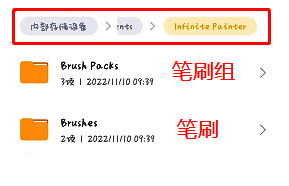 3、在文件夹中找到笔刷、笔刷组,选择分享,可以发送到社交平台、百度网盘中。