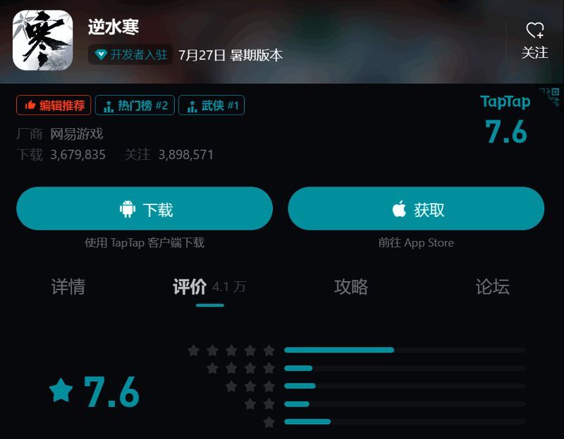 截至目前为止,《逆水寒》手游在超过4.1万玩家打分的情况下,仍能保持7.6分的高分——这是TapTap平台上首月口碑最好的MMO游戏,没有之一。