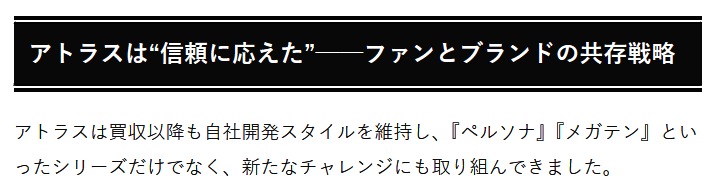 ·Altus社表示,自从合并后一直坚持开发固有的精品IP,包括《女神异闻录》以及《女神转生》,现在也在助力新IP,包括《暗喻幻想》等,需要注意的是,这些新IP并不是为了收益,而是与粉丝对话的成果。