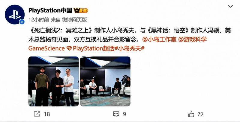 日本游戏制作人小岛秀夫及其团队为出席《死亡搁浅2:冥滩之上》BW特别舞台活动,来到了中国上海。期间小岛与《黑神话:悟空》制作人冯骥、美术总监杨奇见面,双方互换礼品并合影留念。