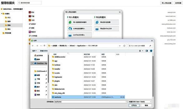 ②在360浏览器中,同样通过“收藏”菜单,找到“导入/导出”功能,选择相应的HTML备份文件进行导入。