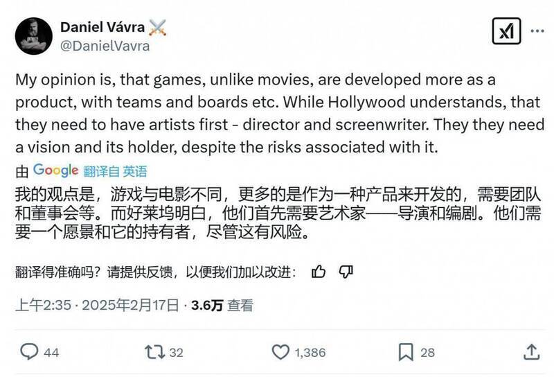Daniel Vavra发推称:“游戏和电影不同,它更多是作为一种产品来开发的,背后有团队和董事会等。而好莱坞深知,他们首先需要的是艺术家——导演和编剧,需要一个愿景以及持有这个愿景的人,尽管这样做存在风险。”