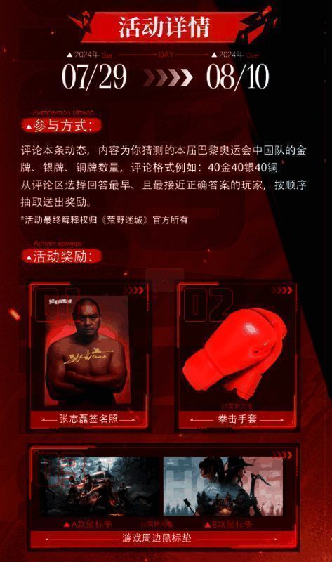 除了拳王张志磊的加油助威视频,《荒野迷城》还携手拳王张志磊推出奥运奖牌竞猜活动。7月29日-8月10日,玩家们可以通过在评论区评论的方式参与活动,一起来猜测本届奥运会中国队的金牌、银牌、铜牌的数量。在奥运会结束后,官方将会最后从评论区选择回答最早,最接近答案的几名玩家,依次送出张志磊的签名照,拳击手套和游戏周边鼠标垫等奖品,快来一起说出你的答案吧!