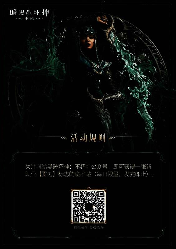 不止试玩,更有好礼!《暗黑破坏神:不朽》还为玩家们准备了惊喜礼物,每天前200名到场的玩家,只需扫描二维码关注《暗黑破坏神:不朽》官方公众号,就能获得新职业雾刃标志的魔术贴一张。黑白的配色简约大气,匕首与风帽元素的组合正是新职业雾刃的象征,仿佛贴上魔术贴,玩家就能成为雾刃的一员,获得呼风唤雨的强大力量。