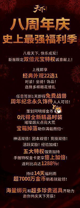 活动期间每日奖励直接送达邮箱!随机职业礼花、50万金币打包秒领,还有8周年纪念币免费送!7月31日、8月13日更有机会获取神秘口令,前往世界频道发送口令即可领取仙灵宝玉、红玫瑰等奖励!天下八周年,喊出你心中的无尽祝愿吧!