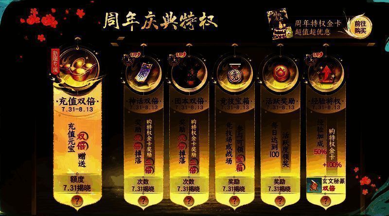 手握特权卡的少侠更享倍上加倍,经验加成直升至100%,神话副本、团本奖励提升至3倍!还能进入特权商店享巨额折扣,道具售价直逼1折!更能直接带走五级紫色宝石重铸符、全新永久饰品等周年好礼,返利比高达1288%!