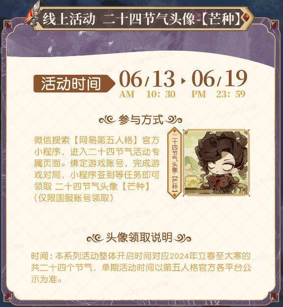 此外,芒种线上活动将于6月13日至6月19日在“网易第五人格”官方小程序二十四节气活动专属页面内开展,绑定了游戏账号的玩家在完成相关活动任务后,即可领取二十四节气头像-【芒种】。头像里,歌剧演员正在环山围绕的庭院里,闲听雨落,清水烹茶,尽享午后惬意时光。