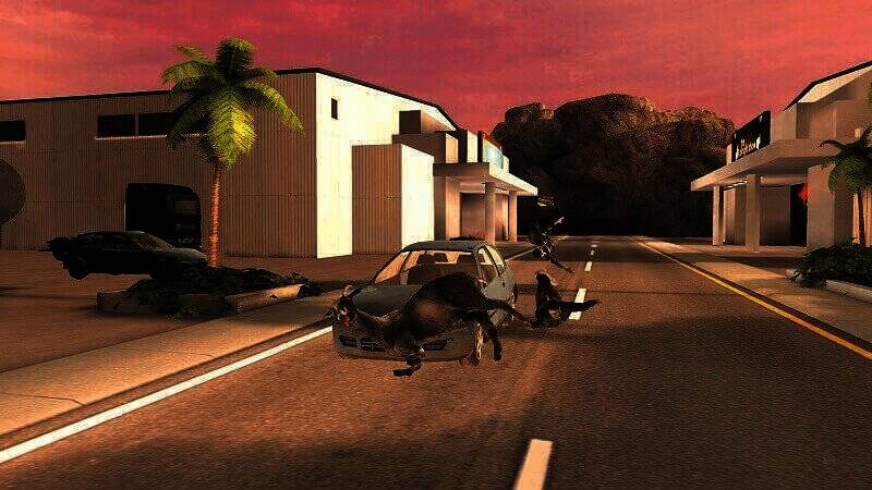 地图包含多张开阔地图,有马路、草丛、树木、房屋、泳池、游乐场等场景。在水中能游泳,部分建筑物栅栏、车辆、玻璃等可被破坏。地图中会随机刷出人类和动物,击杀它们可获得分数。进入游戏后,左边是控制按钮,右边是攻击键、跳跃键等。