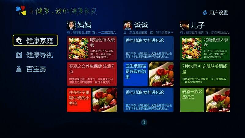 《乐健康》是专门为智能电视定制的应用,它从家庭不同成员的角度考量,综合每个人的生活、饮食和身体健康状况,以图文并茂和视频的形式,每天为不同家庭成员推荐科学合理的饮食、运动和作息建议,还会根据天气、气候变化对衣着、出行给出预警提示。