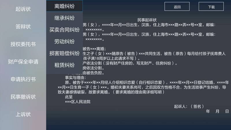 1. 软件界面设计美观,通过遥控器即可简单操作;2. 提供各类案件诉讼流程,助用户了解诉讼事宜;3. 提供全天律师资讯服务,担当法律顾问;4. 详细教导正确诉讼方式,助力了解法律知识。
