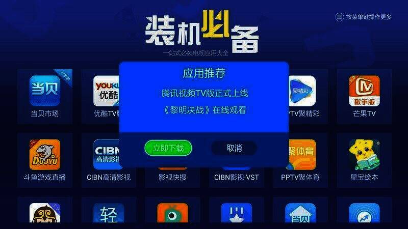 装机必备 tv 版是专为智能电视量身打造的应用软件。它收录了一站式必装智能电视应用,像当贝市场、vst 全聚合、优酷 xl、芒果 tv、龙龙直播、电视家、一键加速等智能电视常用应用都包含在内。能为用户精选最好用的电视必装应用,自动推荐当下最热门、实用的软件。使用也十分简单,用遥控器点击就能轻松下载,安装精品应用更方便快捷。