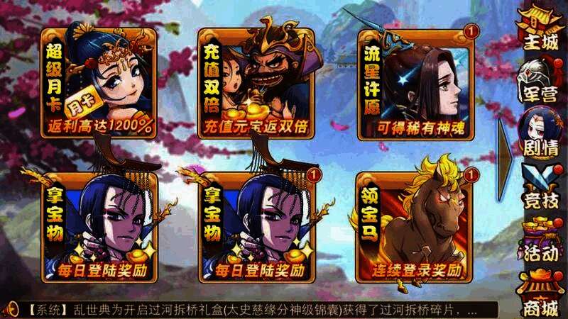 一年365天,平均每天能从游戏内获取至少500元宝,让玩家嗨到不行!各种福利连环送,助力主公轻松到15级!登录第七天,黄忠、马超、刘备、关羽4名顶级神将任主公差遣!