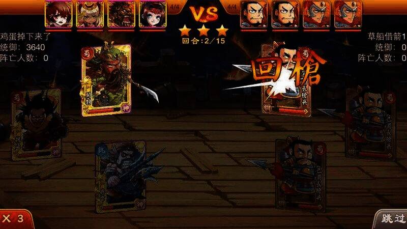 此游戏讲述主人公在三国世界里,收集三国杀武将,以抓捕反贼、消灭反贼头目为目标的精彩历程。作为一款新颖的卡牌游戏,它有贴合三国历史的剧情、惊险的抢夺战略、独特的天梯模式和过关斩将玩法,让游戏体验更独特。玩法为卡牌自动对战,玩家负责布阵,每场可上场三位武将,死亡后替补登场,全阵亡则挑战失败。前期想三星通关的玩家,尽量选生存力强的武将上场,保证存活才能三星通关。