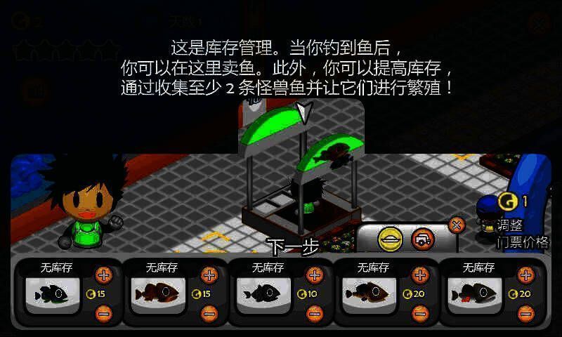 此游戏玩法为钓鱼,通过收取门票和卖鱼盈利。鱼分为普通鱼和怪兽鱼,实际上钓普通鱼意义不大,每种鱼钓到两条怪兽鱼即可(或许更多更好,感觉怪兽鱼数量多繁殖更快,但不确定)。
