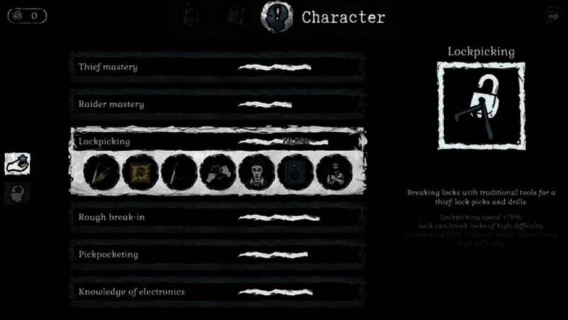 3、学习技能:玩家可自由选择游戏风格,角色的技能成长完全取决于自身行动。玩家能够解锁超过50个技能和特长,其中不乏足以改变游戏玩法的强力技能,助力玩家从普通的街头扒手成长为技艺精湛的大师盗贼。