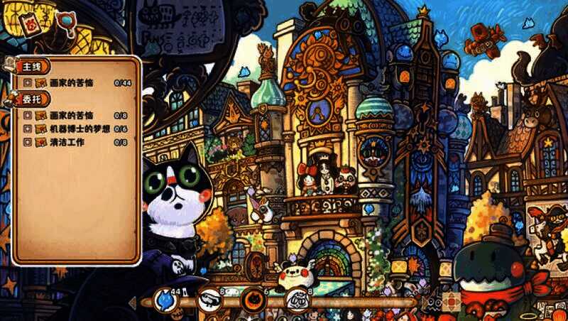 游戏采用独特的昼夜双模式玩法。白天,玩家在场景中探索,通过解谜、寻物以及与NPC互动,收集灵魂碎片和隐藏彩蛋;夜晚,小猫化身“罐头猎手”,在迷雾森林等区域巧妙躲避机械守卫的追捕。整个过程没有战斗压力,玩家还能自由推进27条NPC支线,如“机器博士的梦想”“消失的纸牌”等,通过收集碎片拼凑出完整的世界观,最终解锁多种结局。
