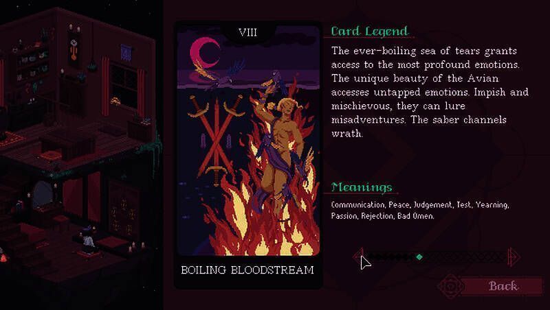 运用创作好的塔罗牌为其他女巫进行占卜。占卜时,根据卡牌组合与解读,为女巫们揭示过去、洞察现在、预测未来。玩家的解读选择会影响故事发展,不同解读方向可能引发角色不同反应,推动剧情走向不同分支。