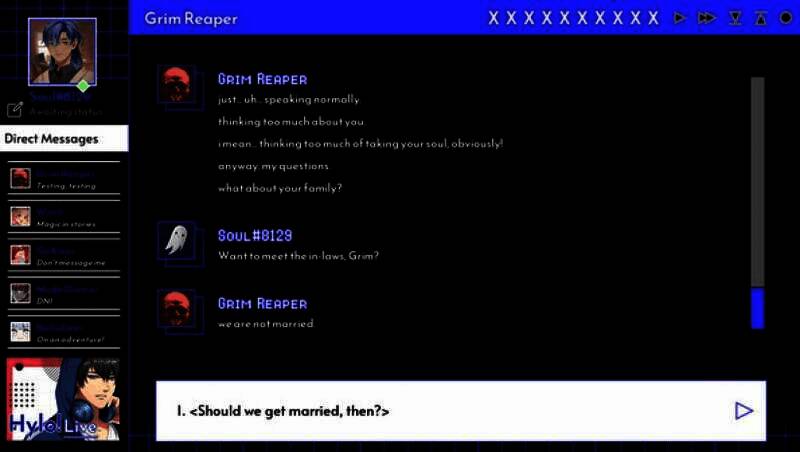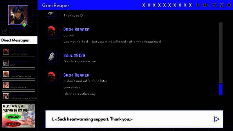 玩家主要借助文字聊天和视频通话与死神展开交流。在聊天过程中,有大量的选项供玩家选择,不同的选择会影响与死神的关系发展方向,进而导向不同的结局。当死神提及取走灵魂时,若玩家选择以调侃的方式回应,可能会让死神感到尴尬,两人的关系会朝着轻松诙谐的方向发展;若选择严肃地质疑,或许会触发死神解释缘由的剧情。