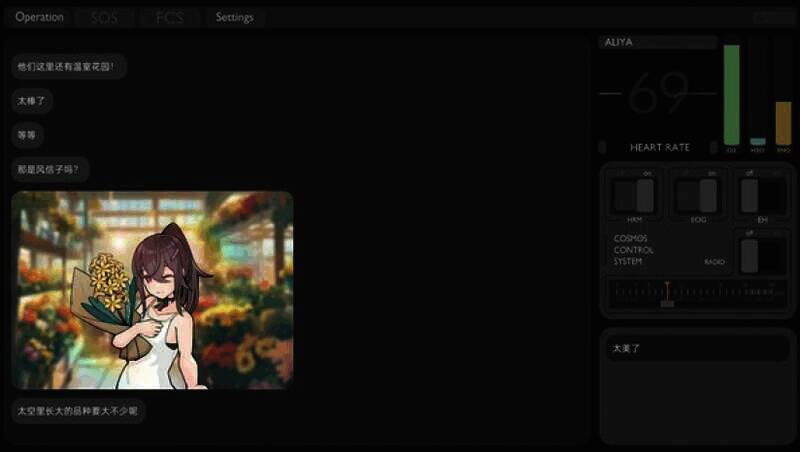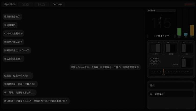 游戏界面采用简洁的设计风格,以灰黑色调为主,营造出规整严肃且神秘的氛围。占据屏幕大部分的聊天界面,模拟真实聊天窗口;右上角的Aliya状态监测板块,直观展示她的身体状况数据;下方的飞船控制系统板块,通过简洁的图标和参数呈现飞船状态,让玩家能快速了解游戏信息,专注于与Aliya的交流和剧情推进。
