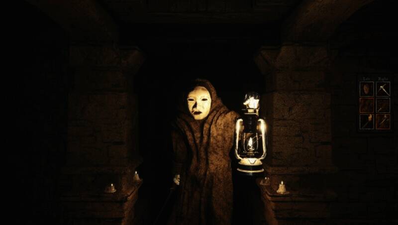 游戏采用复古像素风格,这是对经典地牢RPG视觉设计的一种致敬,同时搭配现代物理引擎,精心渲染出光影和场景细节。面具敌人那诡异的造型、废墟破败的质感,再配合压抑的色调与动态音效,全方位强化了恐怖氛围。例如,蒙面敌人僵硬的动作以及面具纹理的精细刻画,进一步加深了玩家内心的压迫感。