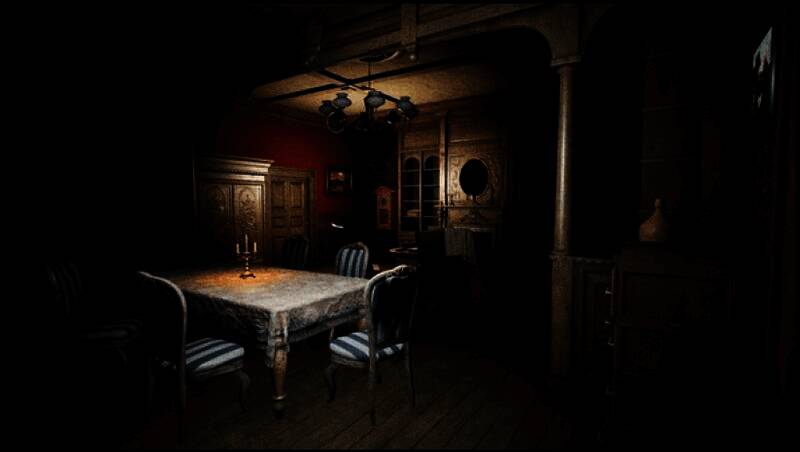 宅邸内剥落的壁纸、散落的血迹以及玩具箱等细节,生动地刻画了破败感。玩偶的设计融合了复古陶瓷质感和毛绒造型,僵硬的动作和空洞的眼神传递出诡异的气息。动态光影渲染出独特的氛围,比如手电筒光束下的尘埃、电视蓝光映照的玩偶脸庞、雾气弥漫的走廊,再搭配音效中的嘎吱声、突然响起的八音盒旋律,共同营造出令人毛骨悚然的视听体验。