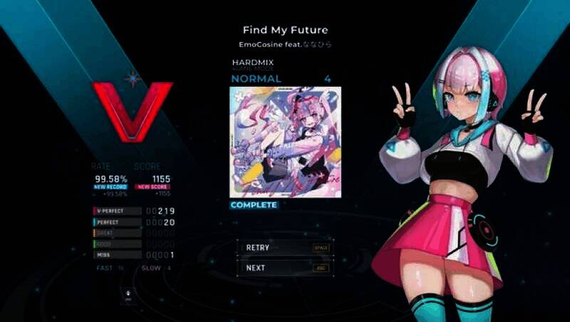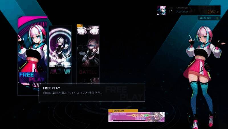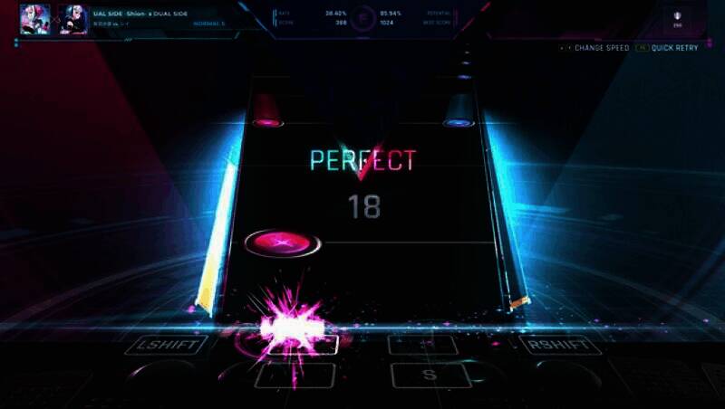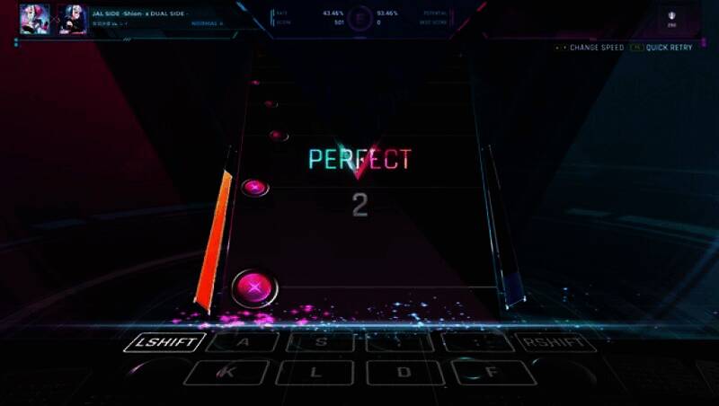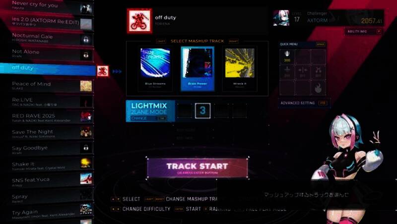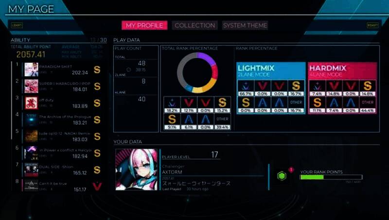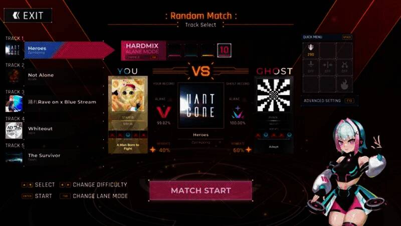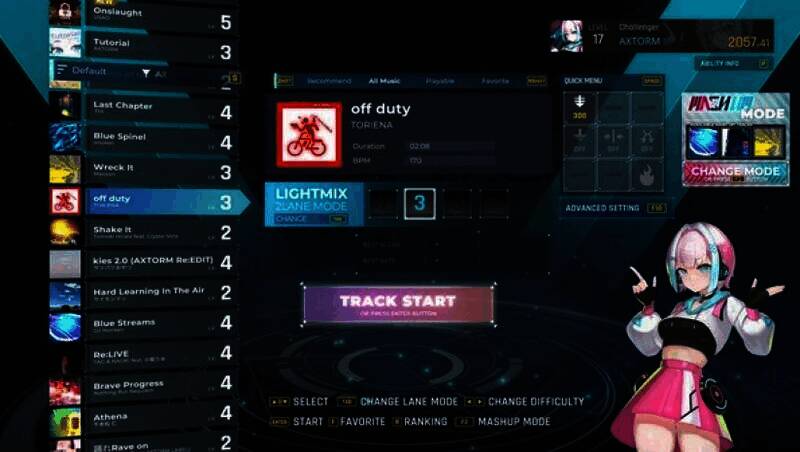 采用左右双音轨设计,提供 2 键轻量(LIGHT MIX)与 4 键硬核(HARD MIX)两种模式。玩家需同步处理双轨节奏,通过滑动、点击等操作完成音符判定,7 种难度梯度满足不同玩家需求。