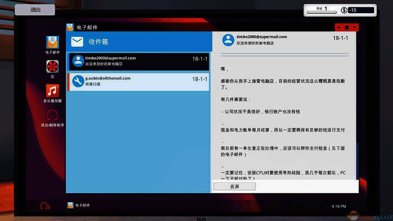 顾客通过邮件告知玩家电脑问题并送来维修,维修完成支付服务费和配件费,还会给出评价。