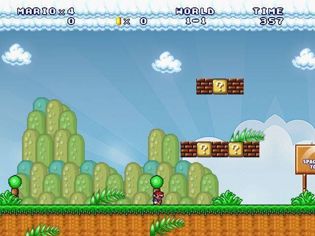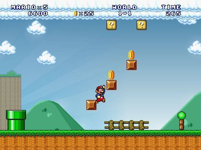 游戏开始后,碰到带问号的金砖,按跳跃键可获奖励;遇到水管,跳上去按方向键“下”,能进入满是金币的水管世界;遇到较远障碍物,按住方向键 + Z 键(系统默认)快速奔跑,再按跳跃键可越过。