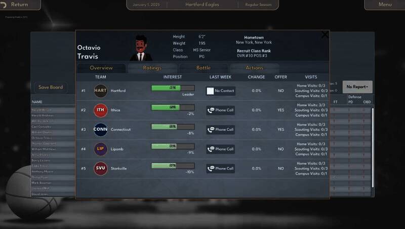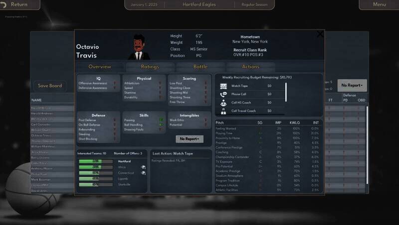游戏引入创新的招聘系统,包含13个关键“投球”,代表篮球项目的不同方面,如受欢迎程度、上场时间、离家距离等,各方面按A - F等级评分,清晰展示学校的优势与劣势。新队员对每个项目的看法至关重要,玩家可通过电话沟通、校园访问等策略行动影响他们对项目的认知。该系统独特之处在于玩家能让新兵了解各项目重要性,战略地塑造其偏好,确保他们对计划的承诺。