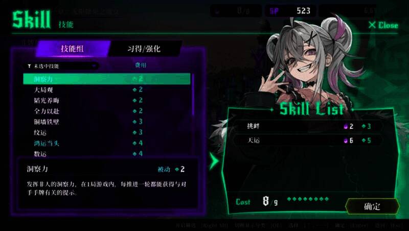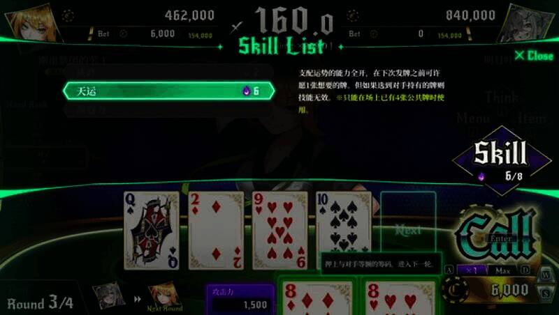 2、使用技能:明日叶能使用赌徒天赋带来的各式技能,可控制手牌牌型、看穿对手手牌等,让牌局对自己有利。