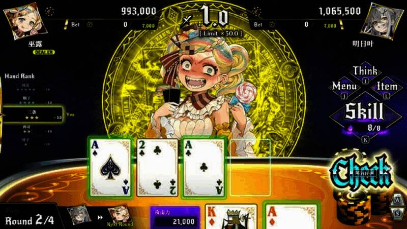 深渊绝赌:千王处刑免安装汉化版是一款由ACQUIRE Corp., WSS playground开发制作,Alliance Arts发行的冒险游戏。“要么爷死,要么魔女亡。来场不是深渊就是巅峰的死亡对决!”主角濑名原明日叶,自封稀世天才赌徒,向统治赌博特区的【魔女】发起挑战,却在胜利一步之遥因神秘力量落败。这是一场揭秘千术、靠扑克一步登天的赌博冒险。