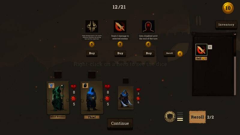 1、每个英雄各自掷骰子,玩家能对选定骰子进行有限次数重掷。