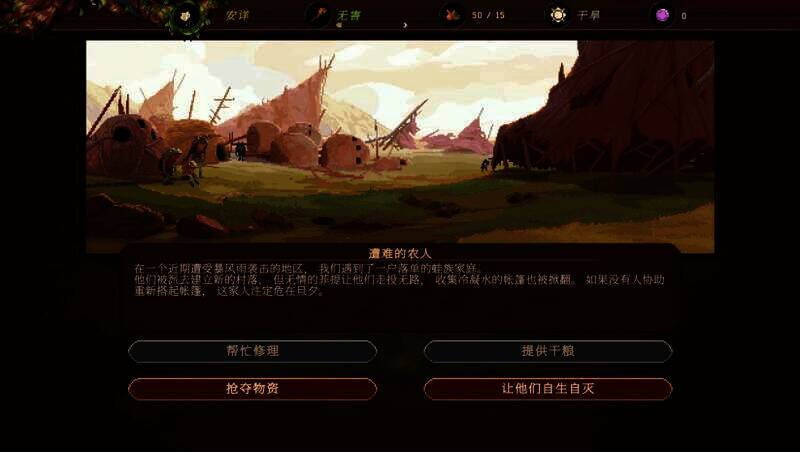 地图随机生成,结合肉鸽机制有200余种突发事件,如遭遇盗匪、发现遗迹或触发部族任务。玩家的决策会影响剧情分支,选择掠夺资源可能激化部族矛盾,外交谈判则可解锁贸易路线。