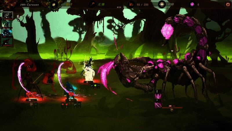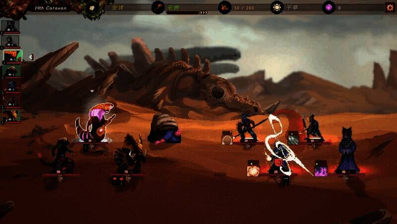采用动态回合制战斗系统,地形和天气会直接影响战术。例如刺客型角色能在沙尘暴中凭借高敏捷发起突袭,战士则依靠护甲抵御酸雨侵蚀。战斗胜利可获取装备与粮食,但面对高等级敌人,需策略性规避或利用道具削弱。